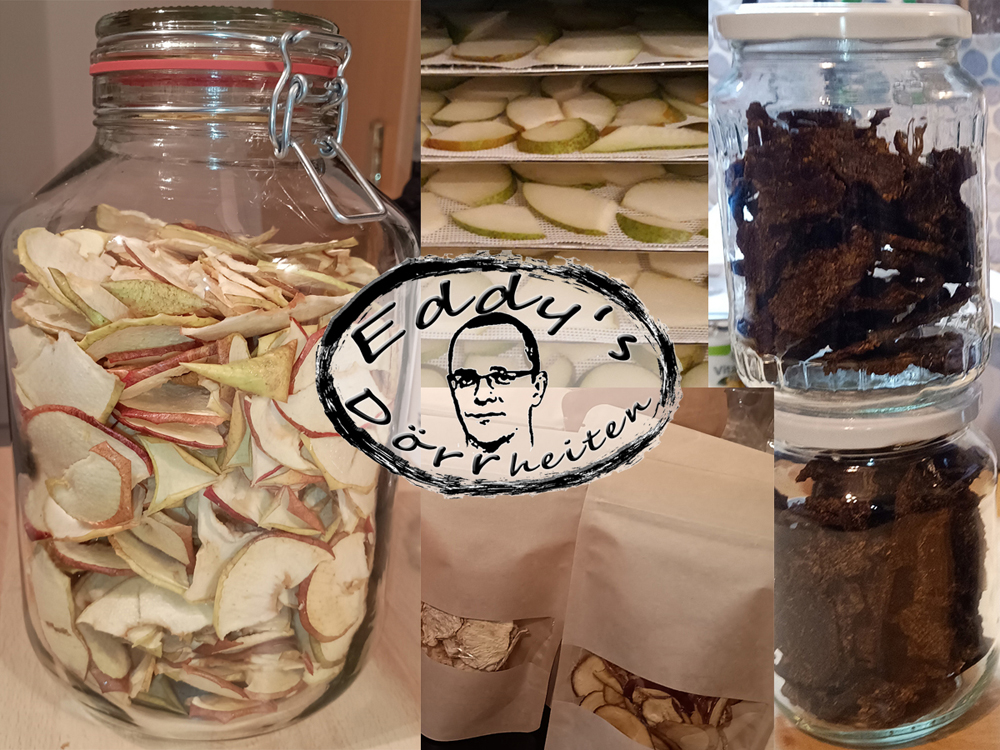 Dörrobst, zu 100 % aus bestem Obst, bzw. Dörrfleisch aus 100 % Rind-, Schweinefleisch, Fisch ...