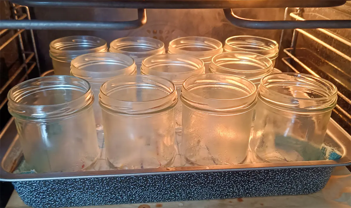 Die Flaschen für Honigwein/Fruchtkonzentrat sterilisiere ich mit Natronpulver (= Backpulver). Einmachgläser werden durch Hitze im Backofen (bei 150° C) sterilisiert, Korken und Deckel in kochendem Wasser.